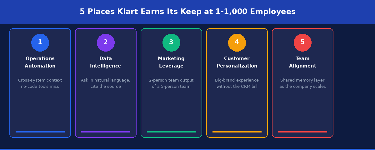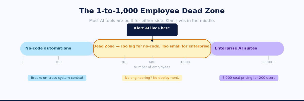 Teams in this range share one uncomfortable truth. They are too big for no-code automations, which break the moment you need cross-system context. And they are too small for enterprise AI suites, which charge per-seat prices that assume a 5,000-person deployment.
