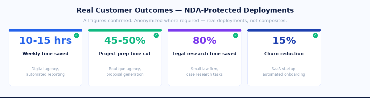 All customers below are anonymized where NDA applies. These are real outcomes, not composites.